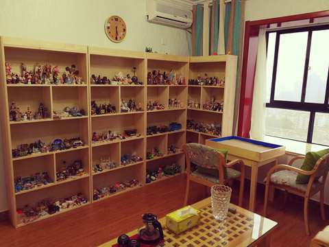 沙盘游戏室:建议采用1000基础沙具,以(人物类、动物类、植物类、建筑类、家居类、交通类、水果食物类、石头贝壳及自然物质类、其他类)为主,方便来访者选择和心理咨询师的操作。